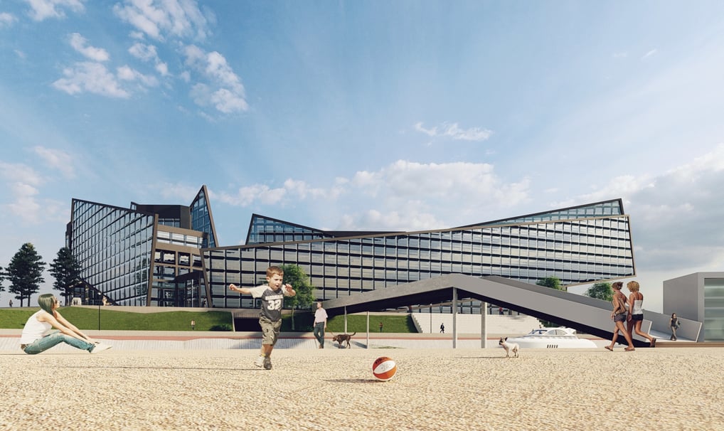 We were told to come up with some kind of idea for the building complex in the last plot of this district. The last hope for this representative area of the city. I designed huge modern polifunctional building, which has 4 star hotel complex with at least 100 rooms, SPA, gym, beauty saloon and lots of chill areas and tarraces. There is also 3 star, 3 stories restaurant with terraces, which has views to old city. To add up there is also huge conference complex with main room which can hold up to 300 people and later transformed into two halls for 150 each. Also halls chairs can be removed and room can be used as dance floor or backstage. There is also second floor with small meeting rooms from 10 to 50 people. Finally building also has huge art of cooking academy complex, which has 20 classes, one huge amphiteathre which houses up to 200 people and its own roof garden for laboratory experiments!