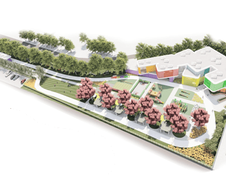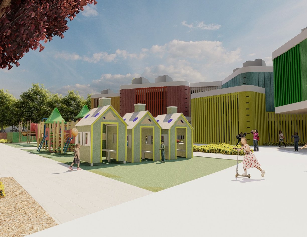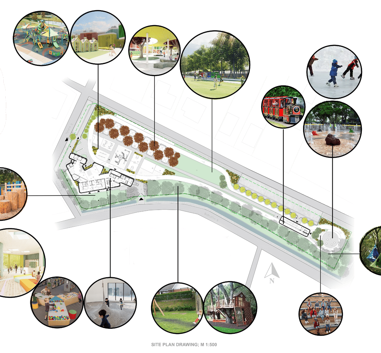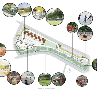 Site's left plot was used very racionaly and functionaly. First of all, the site has main circular movement system, besed on train-station principals - small children train, with lots of stops and driving schedulle. Further more functional zones are separated to active, relaxation and education. Whole site is surrounded by beautiful colorful trees. Being inside the plot seems like being in a wonderland, where you can not only learn but play and enjoy your time with friends!