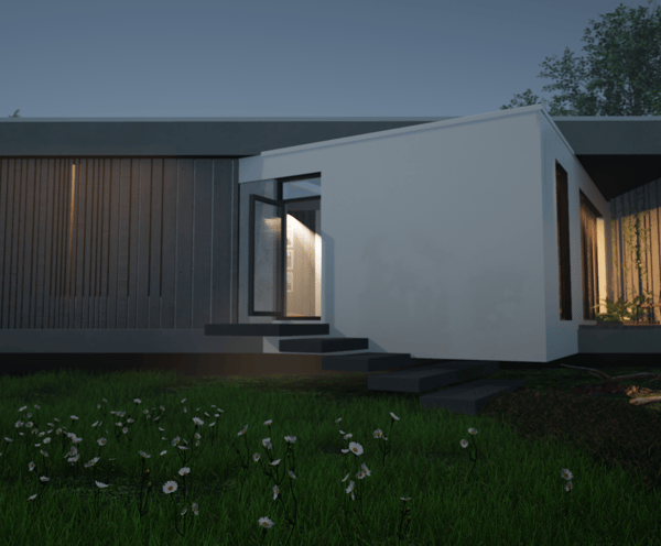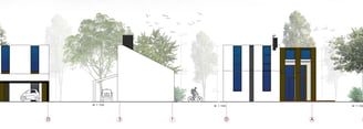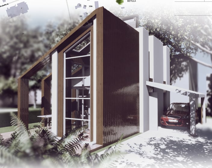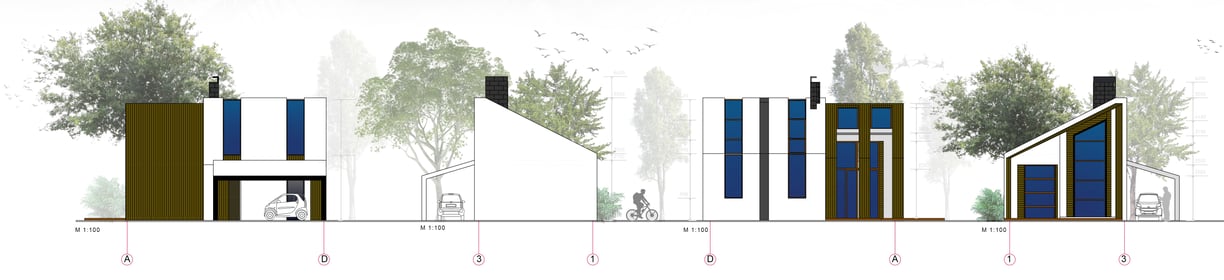 Small family house for summer stay (45 sq. mtr). Concepts comes with words "flow". Flowing and at the same time flowting house. Two simple regtangular forms joined in not so simple way. Despite that "forms follows function". One of them are parpandicular to the site boundary, another follows small relief of the plot and also faces directly to the south (allows to install very efficient solar panels), also completely blocks views from street and creates privacy for inside garden. These forms also automaticly creates 3 wonderful teraces. One for morning coffee, one for family gatherings and one for private time with yourself.