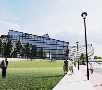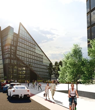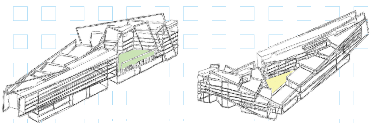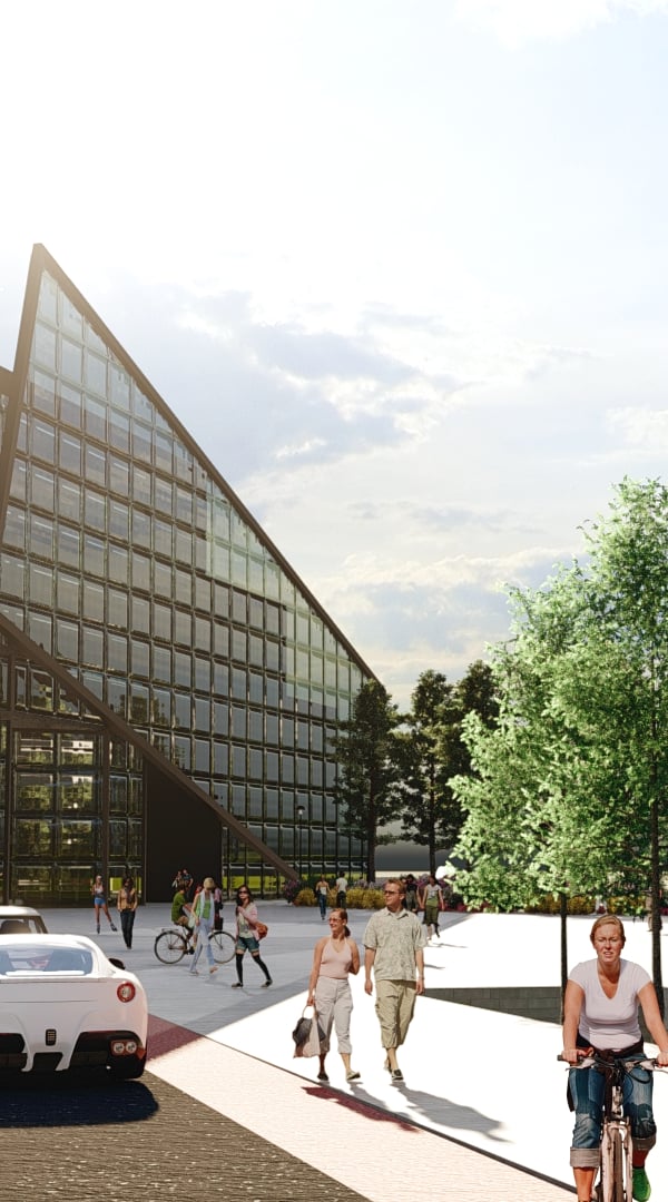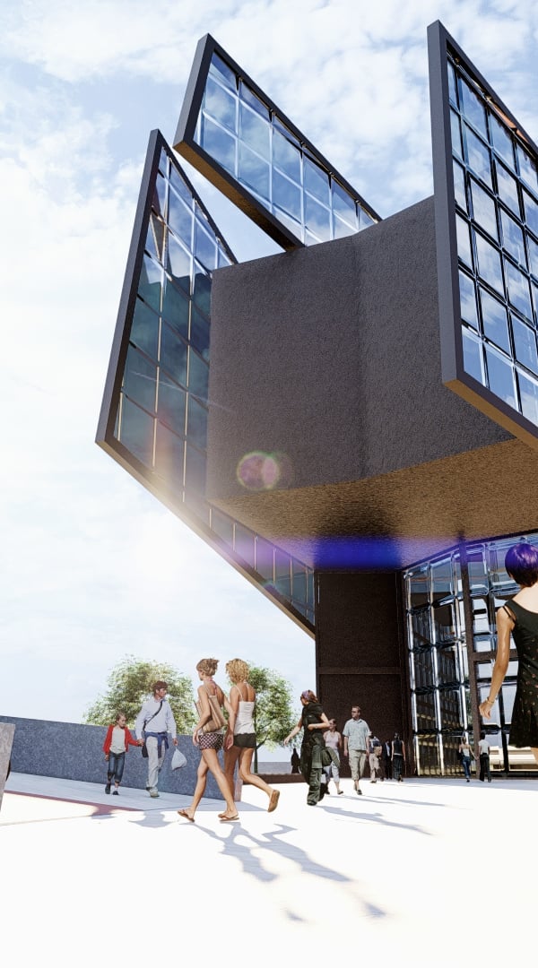 To ensure its modern looks all the facades are made out of dark metal and mirror glass. To add up huge rectangular shapes are added onto facades to furher more create triangle shape illusion.