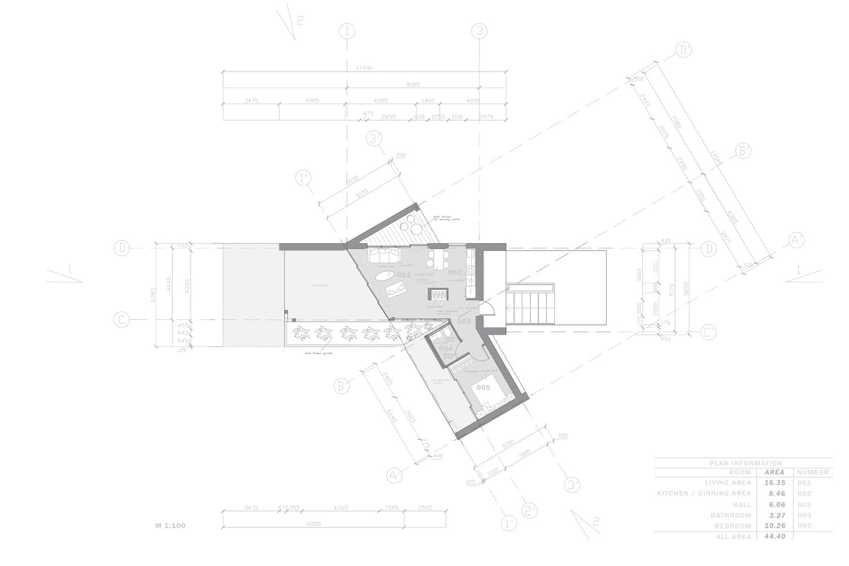 Small house for student. (40 sq mtr.) Main aim of design was to mimic historical middle XX century Kaunas' city architecture. The site is loacated in the middle of soviet time apartment building's yard. Main problem was privacy. Which was solved by creating thin vertical windows.