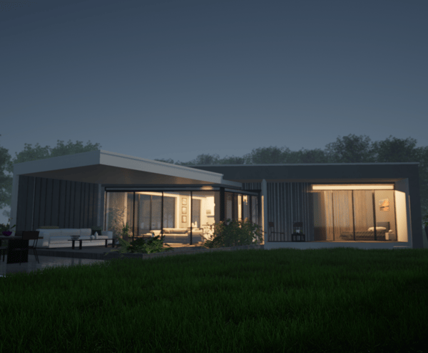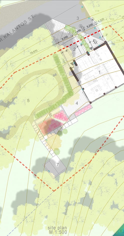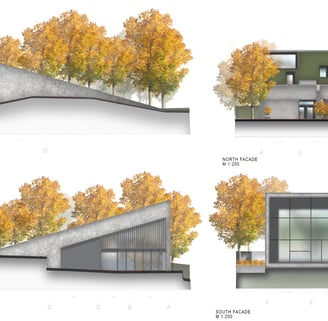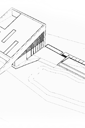 The slope of the plot is use in a advantages to make that the main "picture"'s frame seems to be floating above the ground. Building's sloped roof is also covered with grass which simulates pushed out relief. Inside you can find garage, 5 bedrooms, 5 bathrooms, 1 huge living room, painting studio, gallery with views to the lake and meeting room with clients.