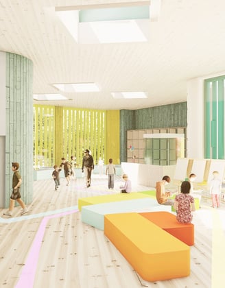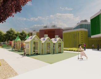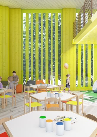 Kinderganden in forgotten suburb in Kaunas. Main design idea comes from lego. Building form is cretaed from different huge lego block strcutures. They are intensionally placed in chaotic way in order to symbolise that the building was build by children themselves while they were playing with lego pieces.