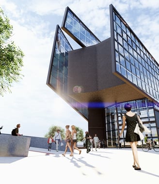 Mirrored glass plays a huge role not only in functionality of the building but also philosofical part. Mirrored glass helps inside of the building not to heat up in hot summer days. It also perfectly reflects Kaunas old city. It's dream come true not in literal way. Cause every citizen of Kaunas wanted that district of Piliamiestis would look like exactly as Old part of Kaunas. But after huge invasion of apartment buildings with no taste in architecture everyone gave up. This building is like broken mirror of citizen dreams, they are already long gone and mirror is shattered but last pieces of that "dream reflection" still tries they best to reflect old dreams of the city's inhabibats.