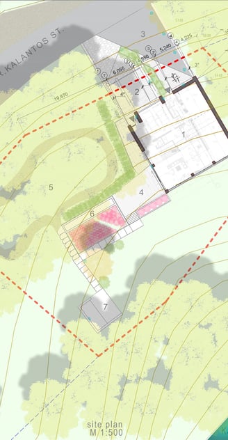Situation was very difficult. Site was 1 ha big, but over 70 procent of it was covered by city's drainage systems, which has huge protected area, where you cannot build any buildings. I was left with 900 square meters avaivable land. In order to fit in this small plot I had to use consoles. To add up, lithuanian building code do not allow more than 2 story kindergardens, in order to win more useful space I used antresoles which in our building code do not count as a floor/story.